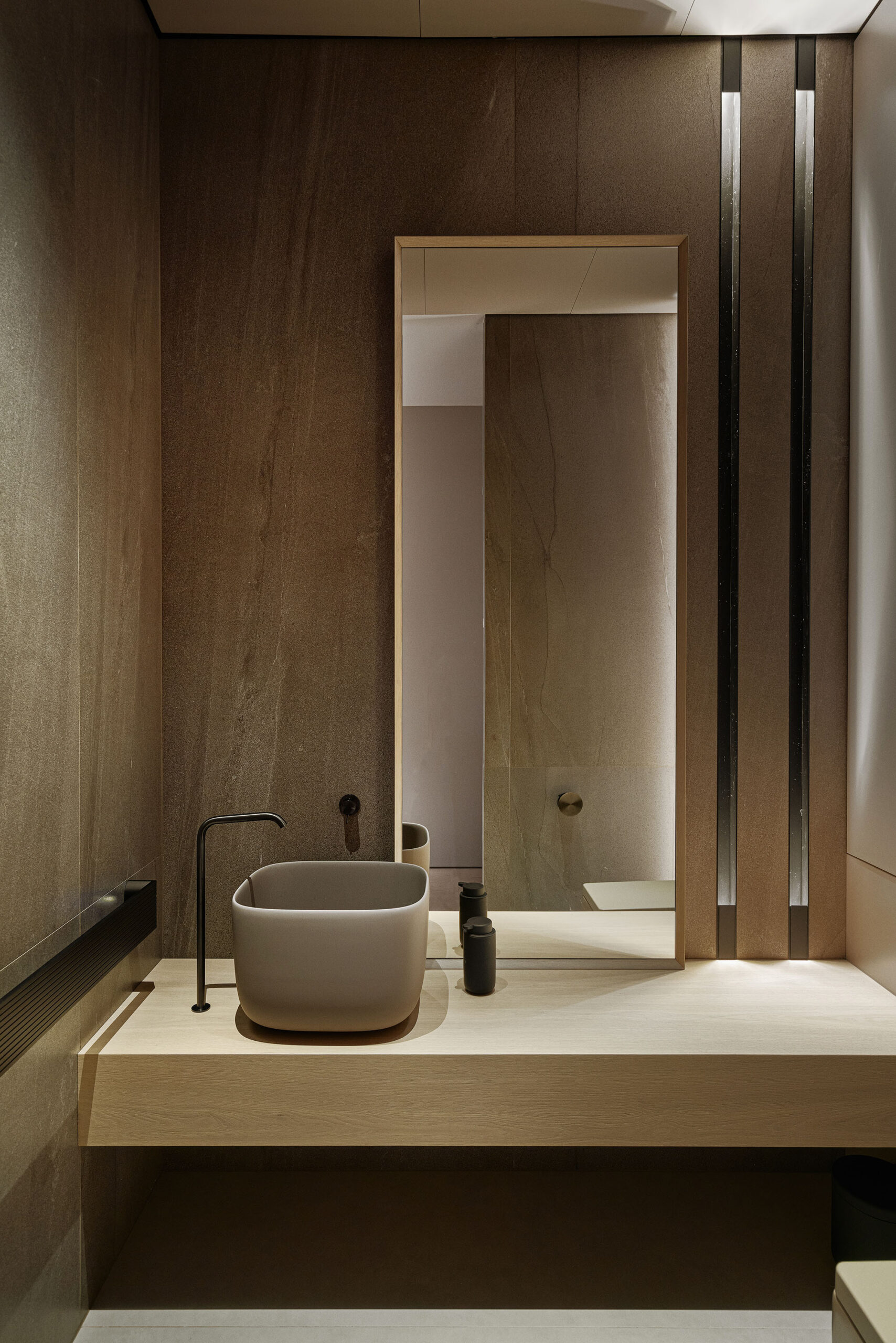 The private area of the homeowners is a sanctuary of comfort and relaxation. The master bedroom seamlessly connects with an open bathroom, where a sculptural washbasin and a freestanding bathtub serve as focal points. Glass sliding doors divide the space, leading to a more intimate area with a walk-in shower, toilet, and sauna.
